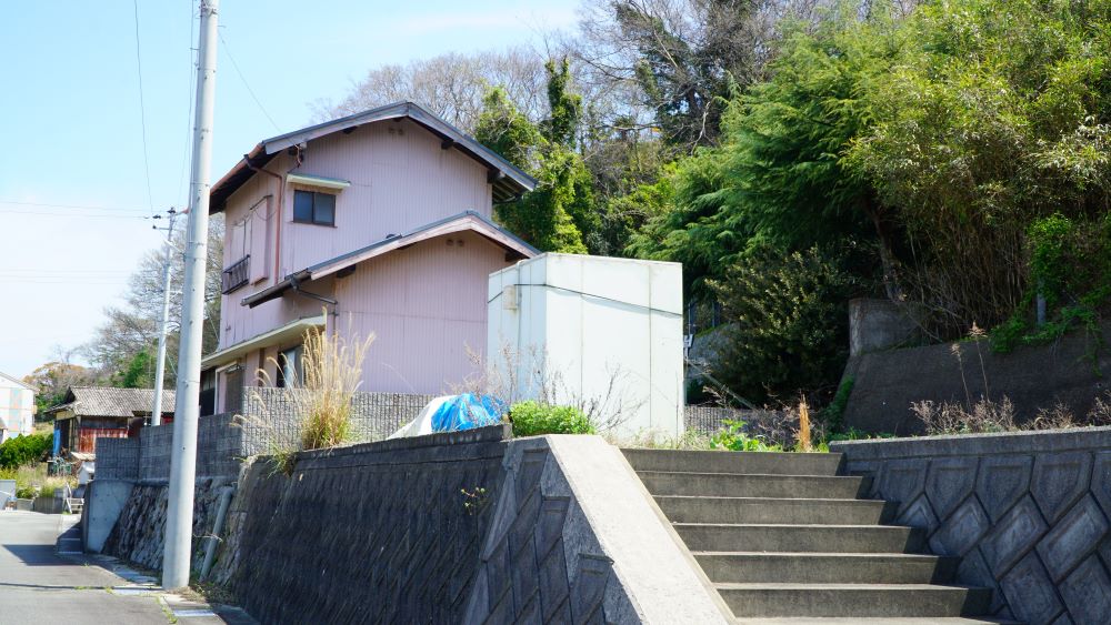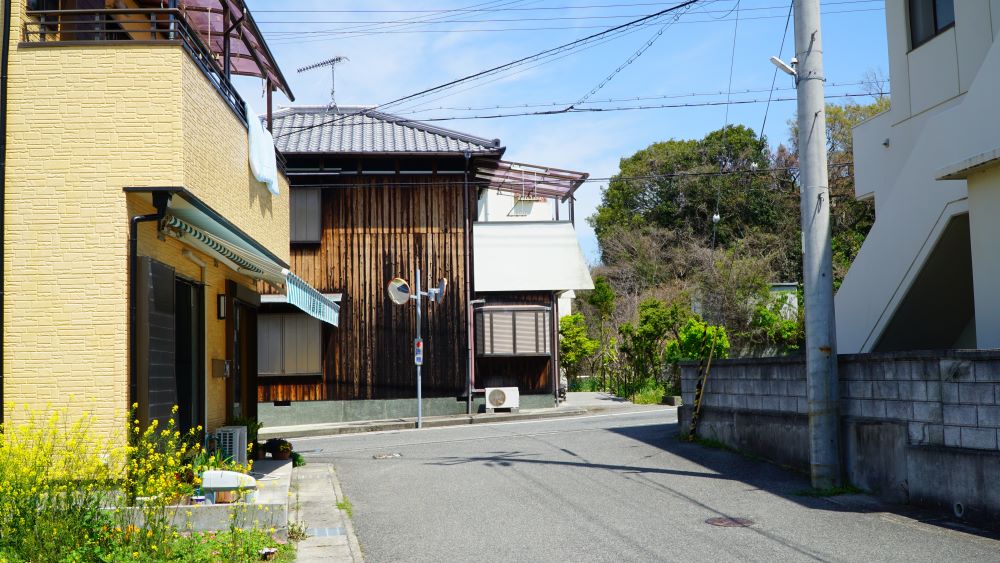 写真左端の二階建ての民家が