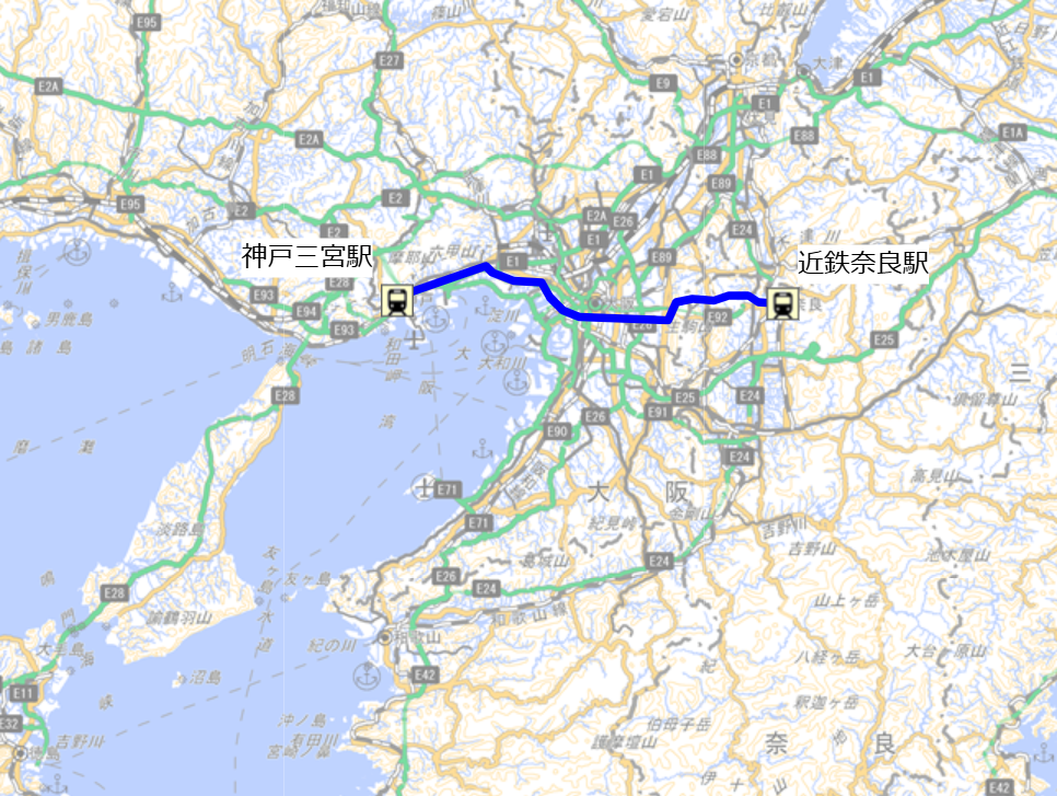 三宮から奈良まで直通電車が