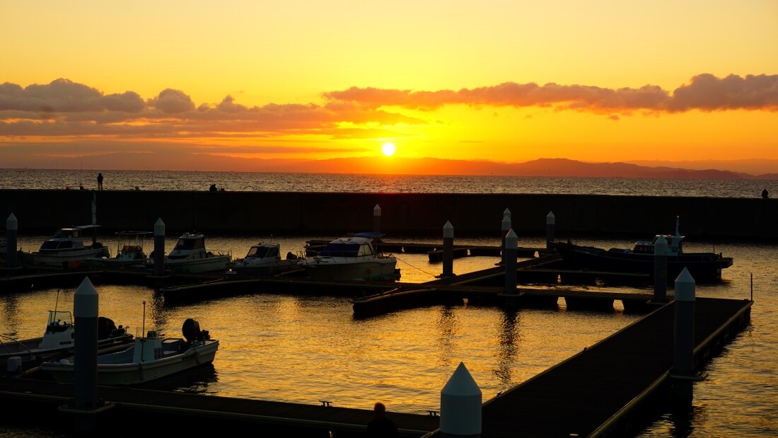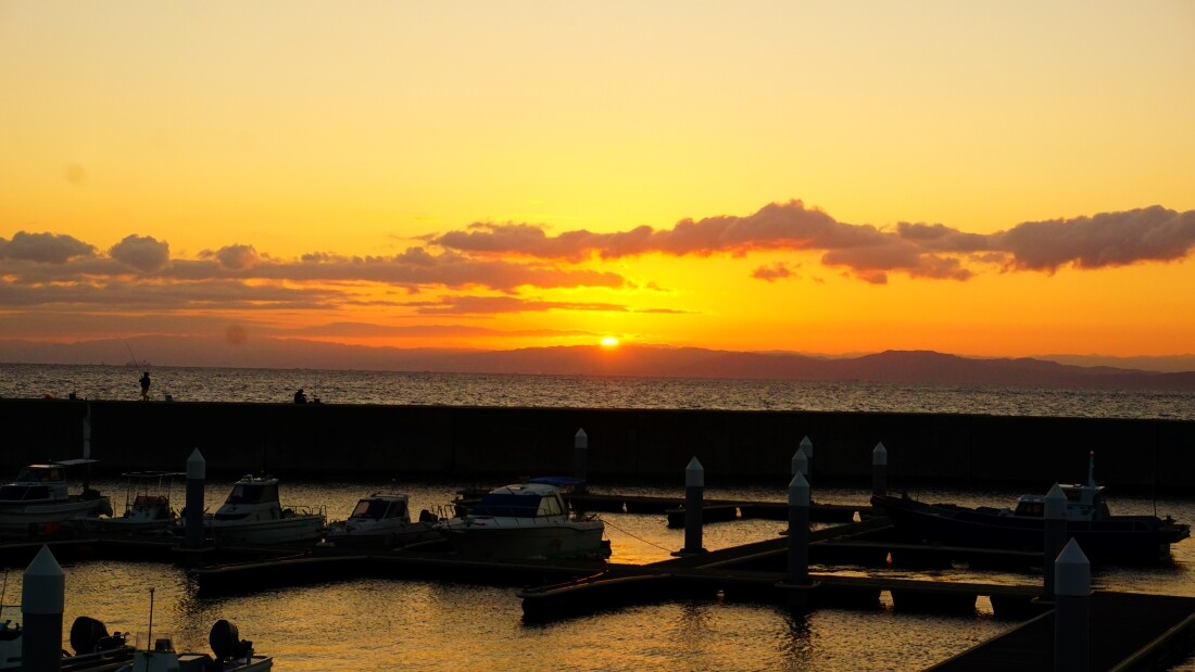 大阪湾から昇る朝日を撮ります。
